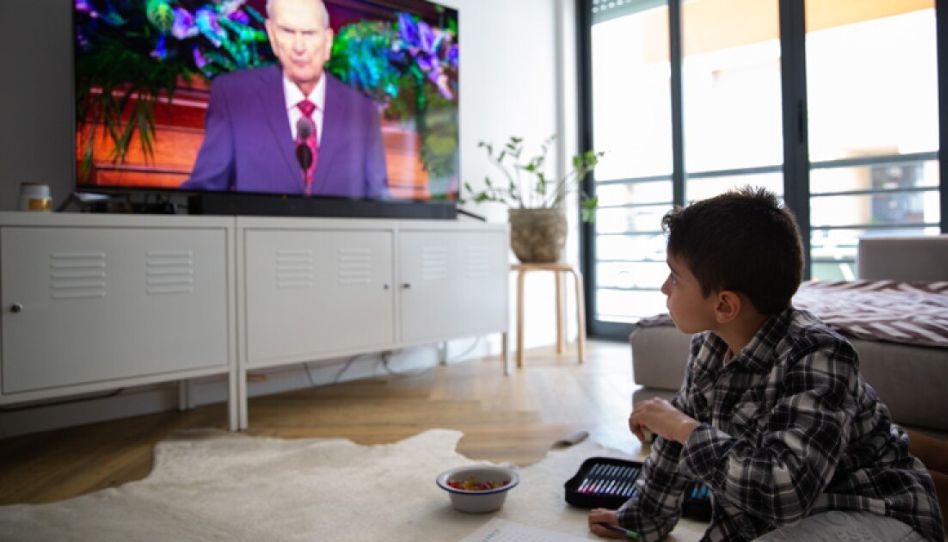 Ein kleiner Junge schaut zu Hause eine Ansprache der Generalkonferenz von Russell M. Nelson.