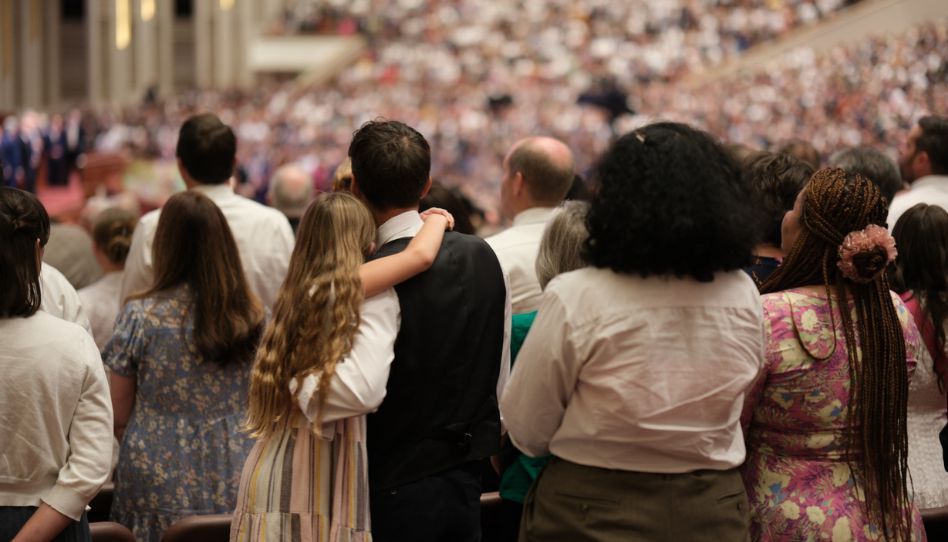 Publikum steht am Ende einer Generalkonferenz und schaut in Richtung des Propheten und der anderen Generalautoritäten.